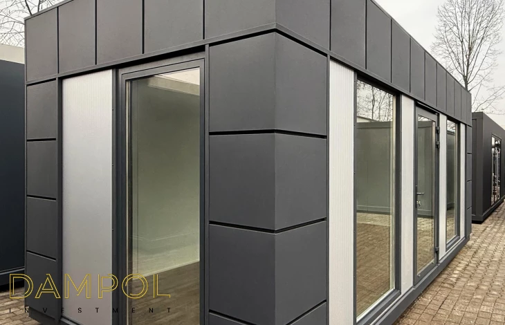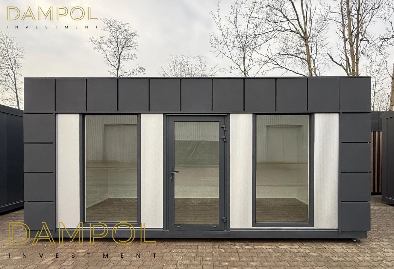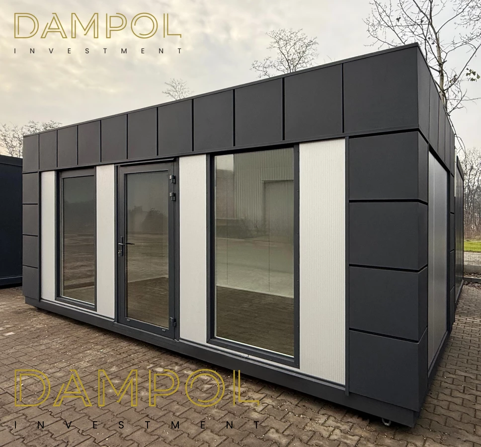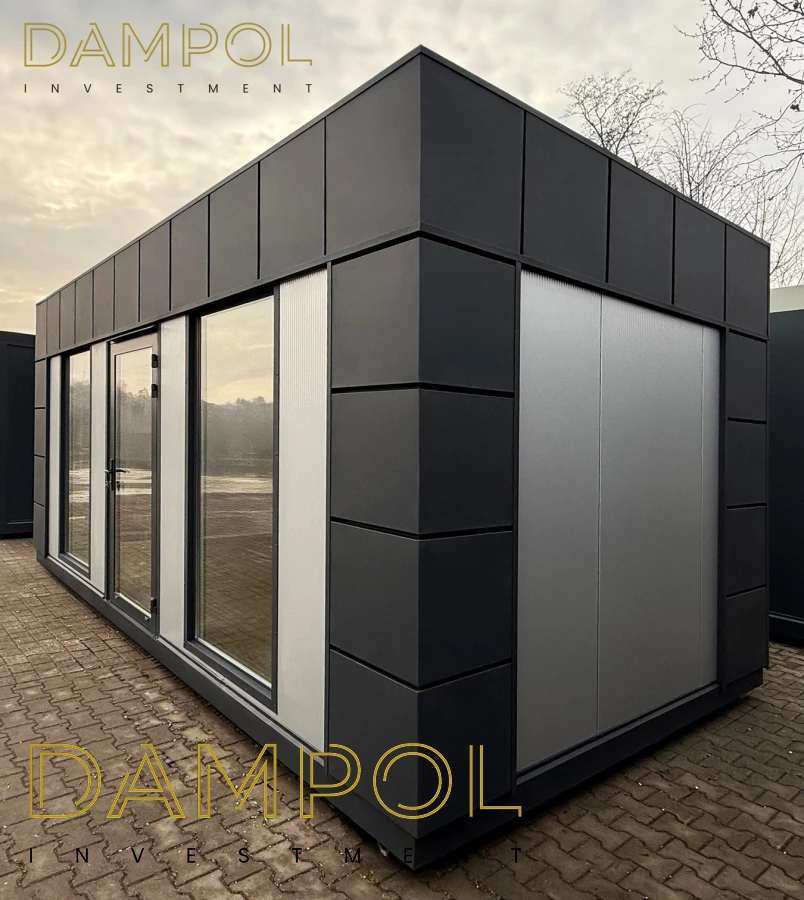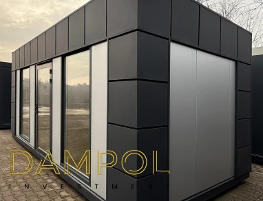 Na froncie: drzwi aluminiowe przeszklone, 2x szyba 986x1980, na prawym boku okno aluminiowe 100x210.
