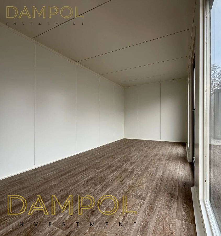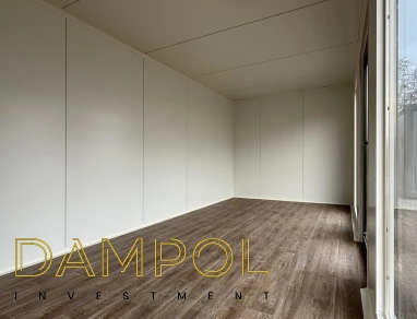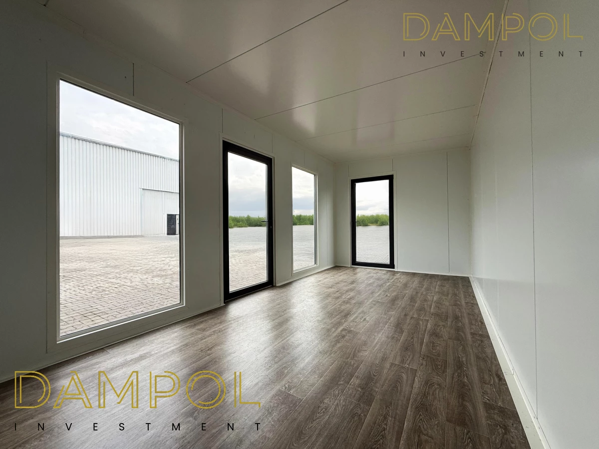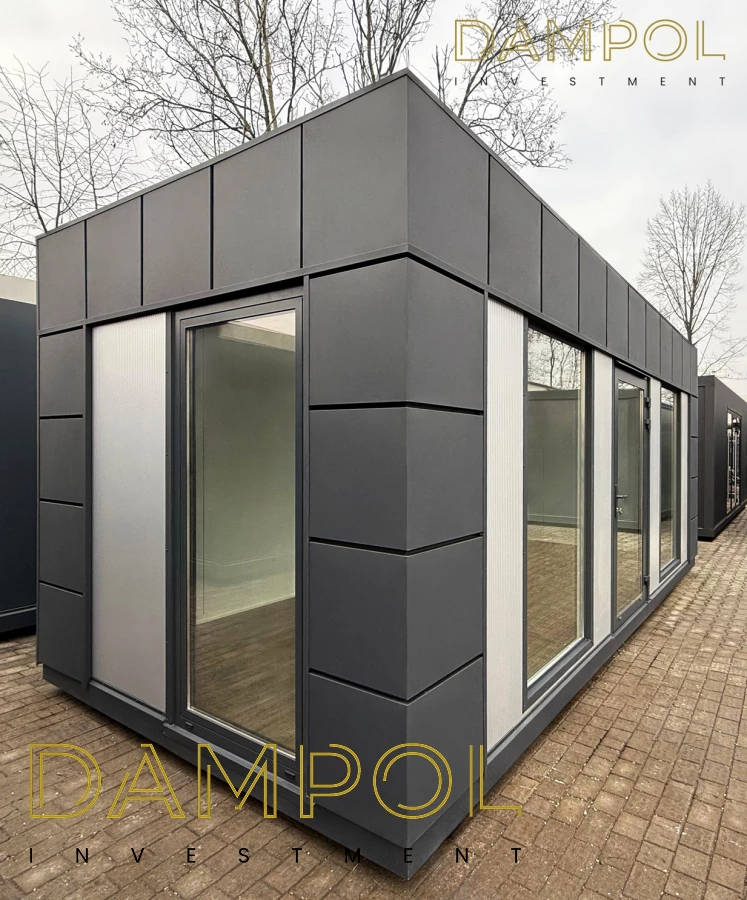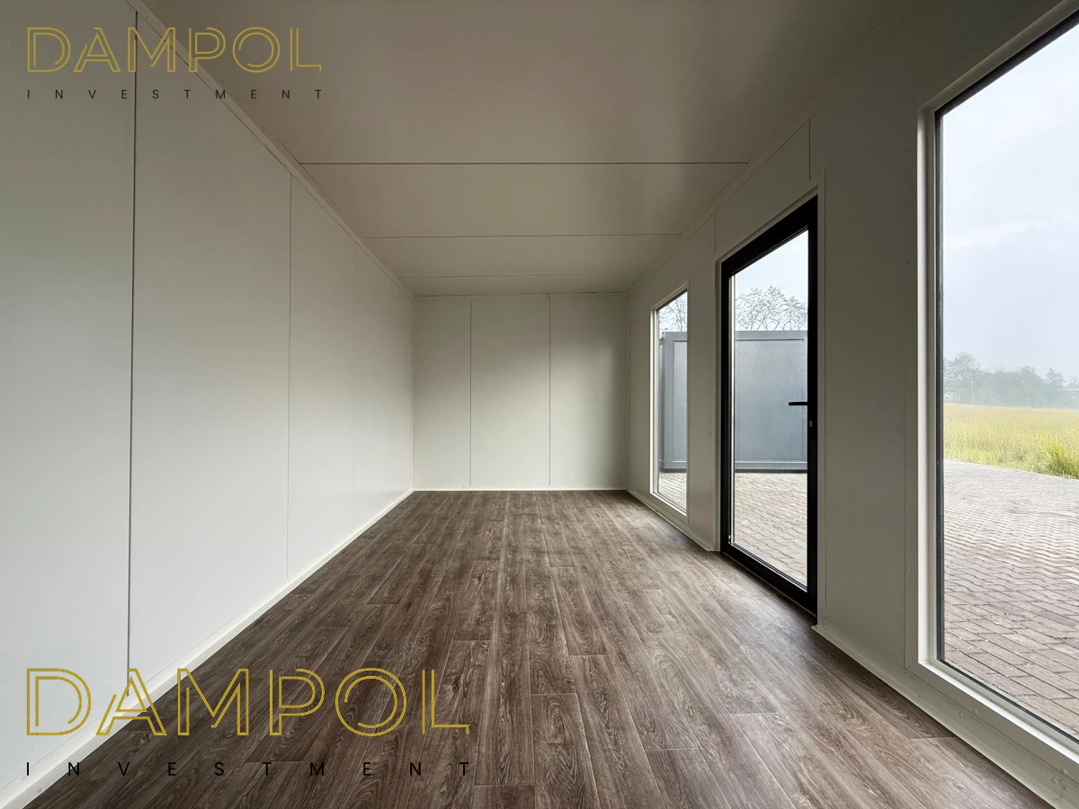 Na froncie: drzwi aluminiowe przeszklone, 2x szyba 986x1980, na prawym boku okno aluminiowe 100x210.