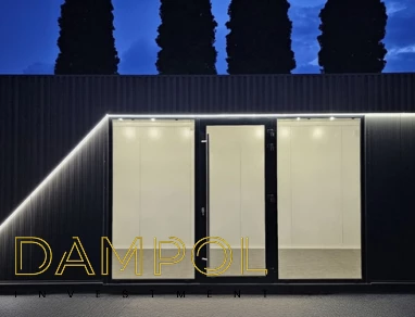 Stolarka aluminiowa kolor ramy czarny, szyby stop-sol, drzwi z pochwytem i samozamykaczem połączone z 2 witrynami nieotwieranymi, na prawym boku witryna stała 97x200 szyba stop-sol.