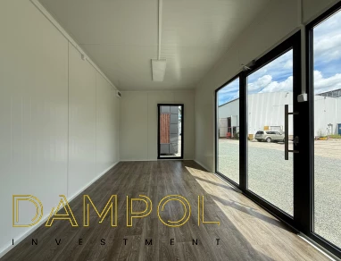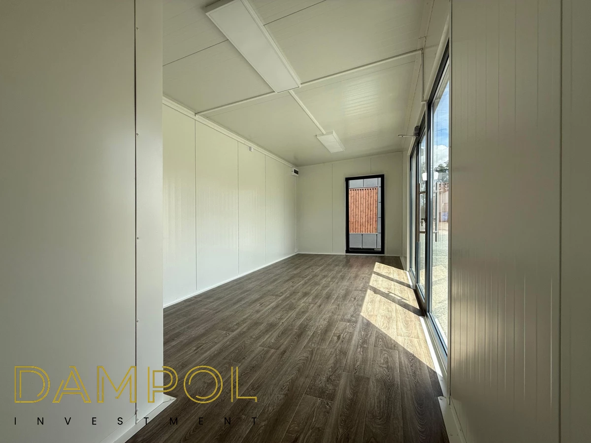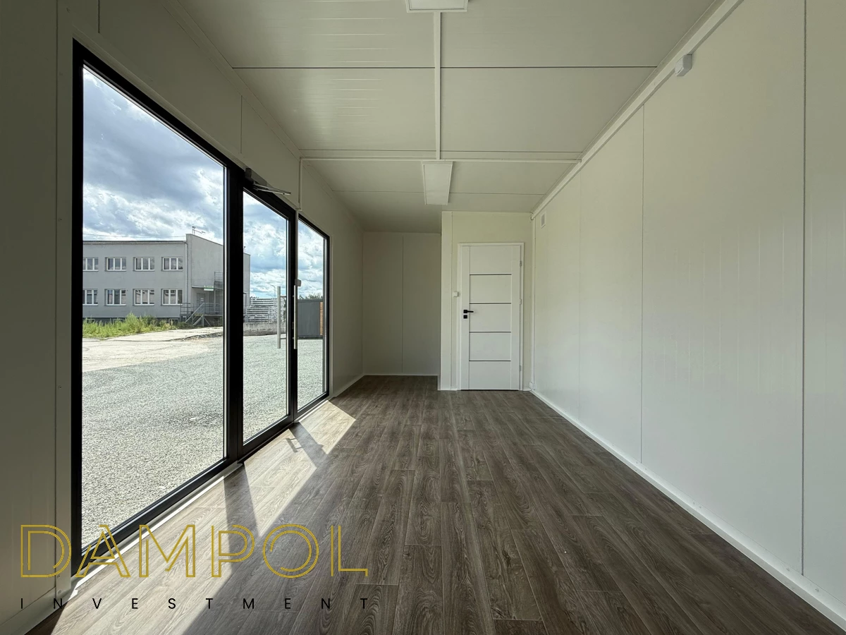 Drzwi aluminiowe przeszklone z pochwytem i samozamykaczem, 2x szyba stała (fix), 1x okno balkonowe, wydzielone pomieszczenie z oknem PCV 50x50, instalacja elektryczna jednofazowa, 2x włącznik, 3x lampy, 2x gniazdka podwójne, 2x gniazdka pojedyncze.