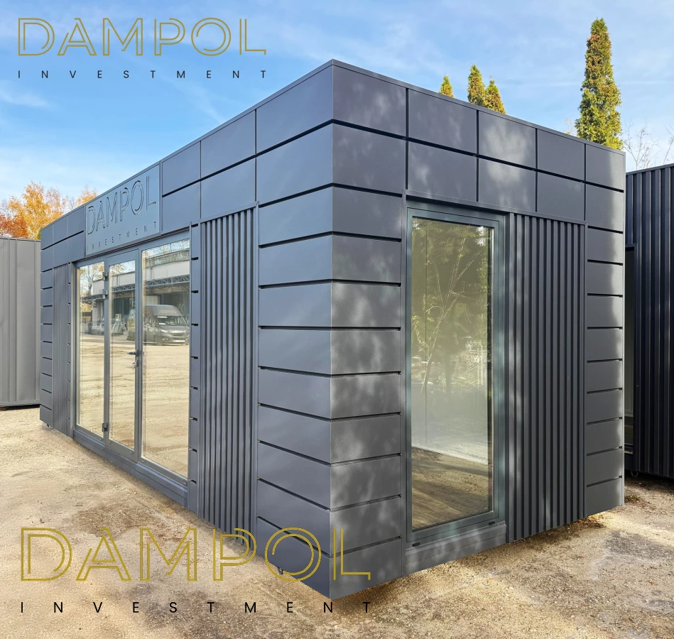 Na froncie aluminiowe przeszklenie ok.350x210 (drzwi z samozamykaczem), na prawym boku okno aluminiowe balkonowe 97x210, element dekoracyjny: front + 2 boki - kaseton kolor grafit + lamele kolor grafit.
