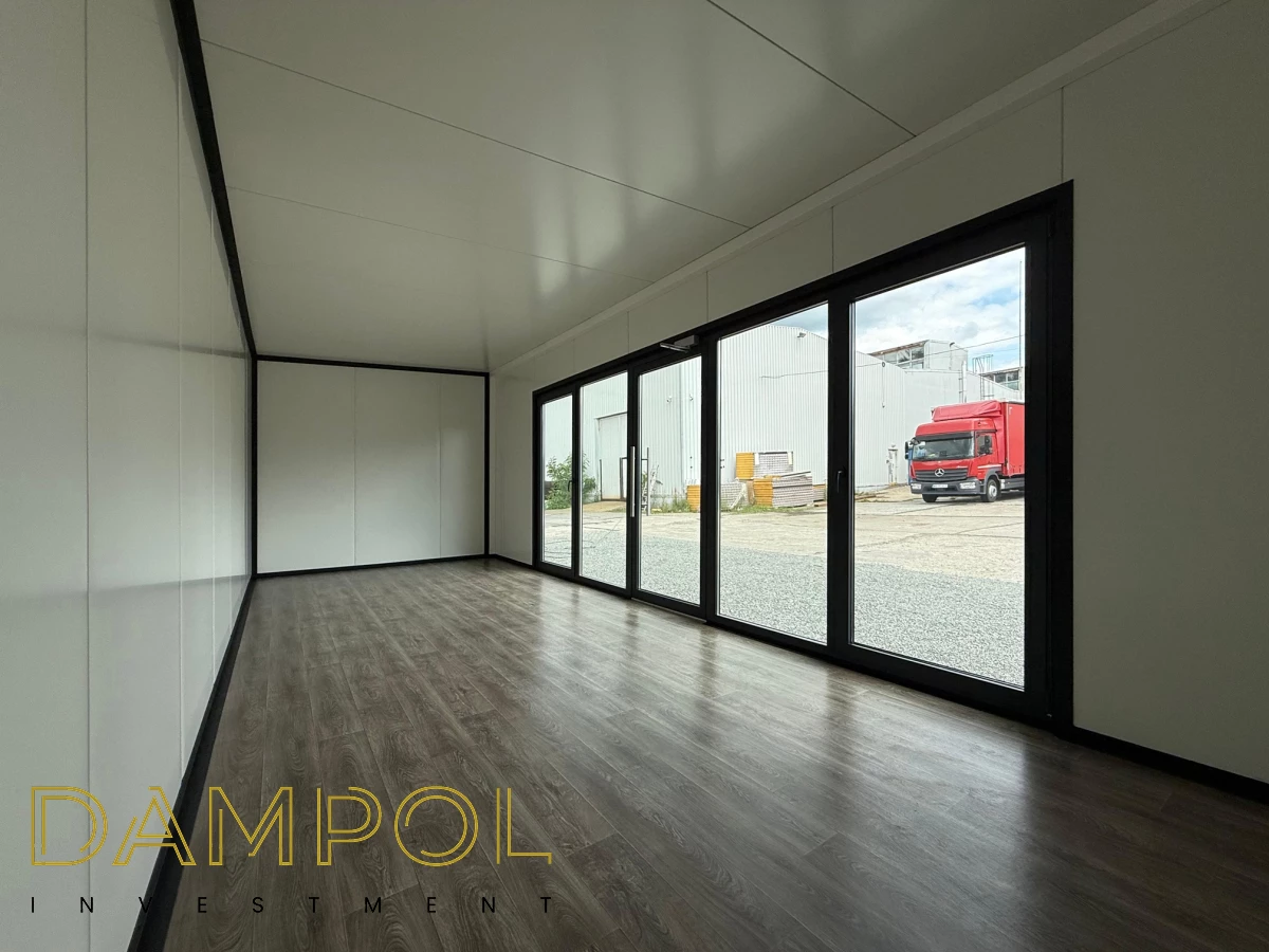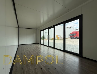 Na froncie aluminiowe przeszklenie ok.500x210: drzwi połączone z 2 częściami stałymi i 2 cz. R/U