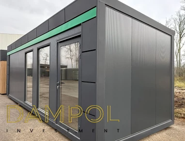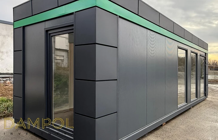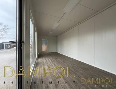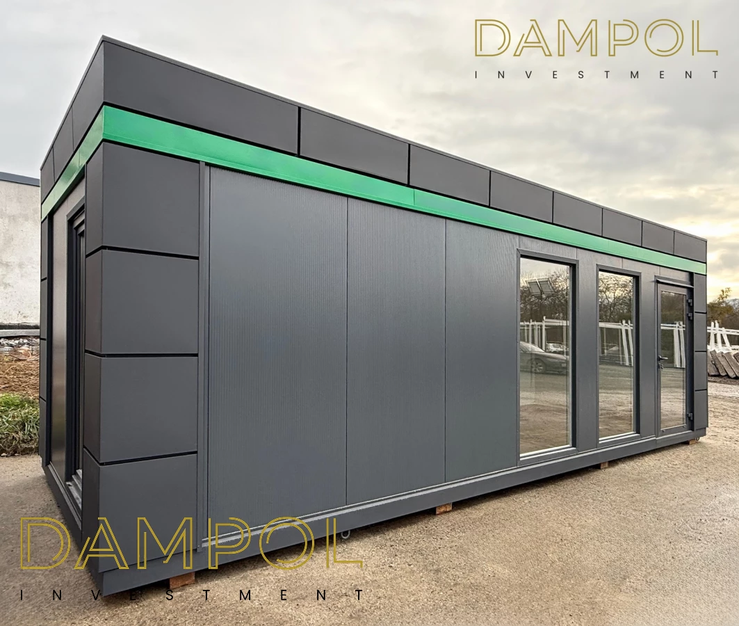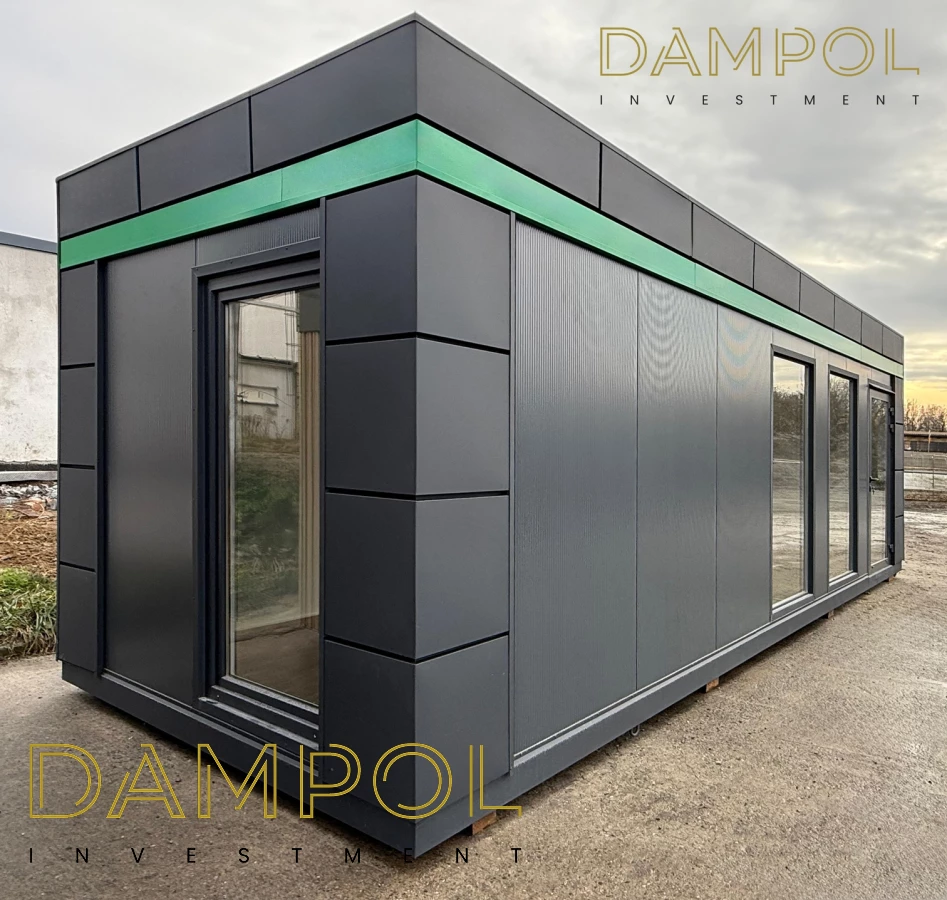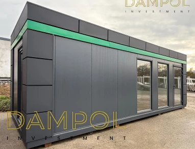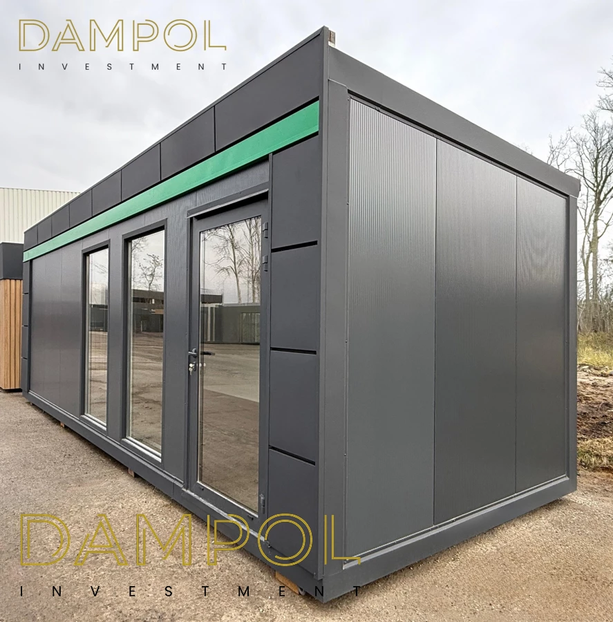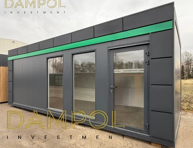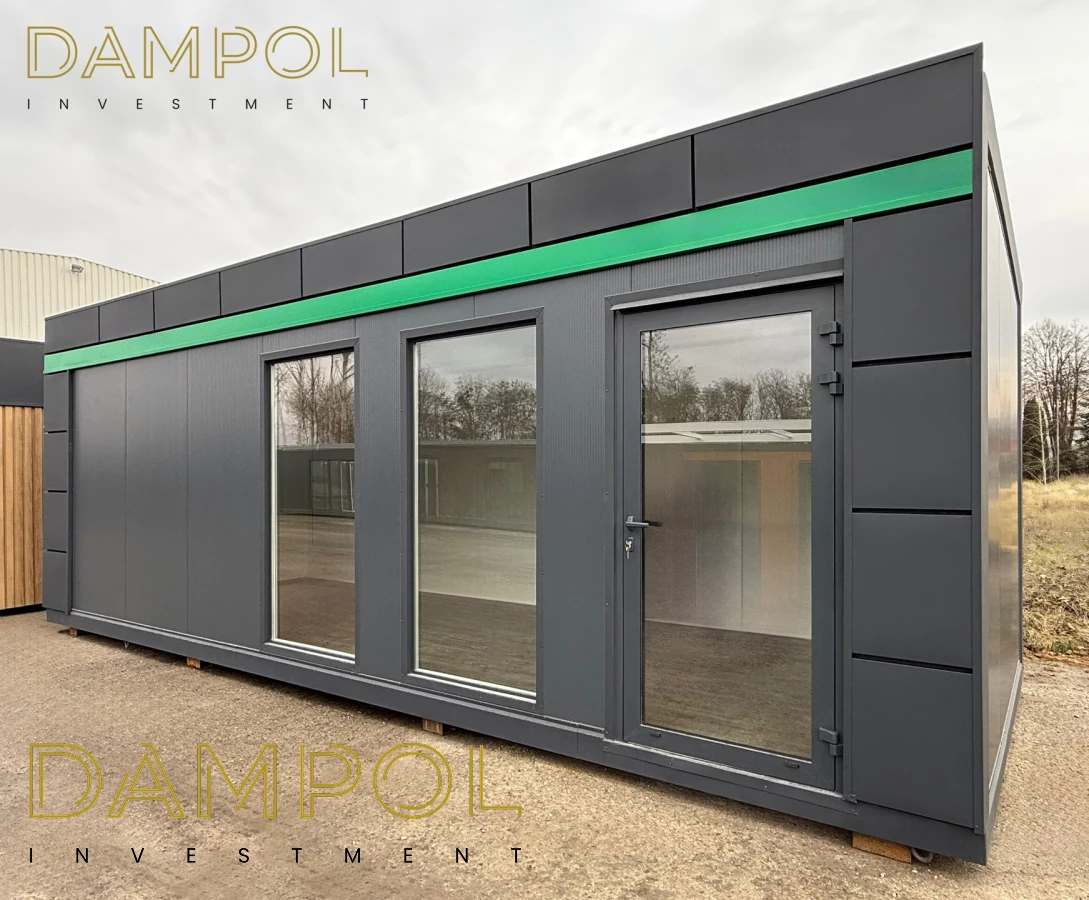 Na froncie: drzwi aluminiowe przeszklone, 12x szyba 97x200, Na lewym boku 1 x okno PCV 97x210