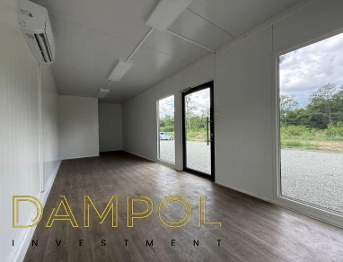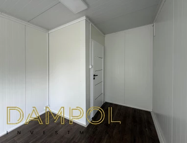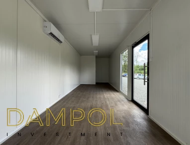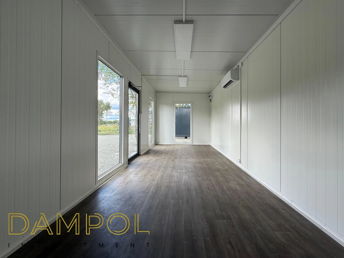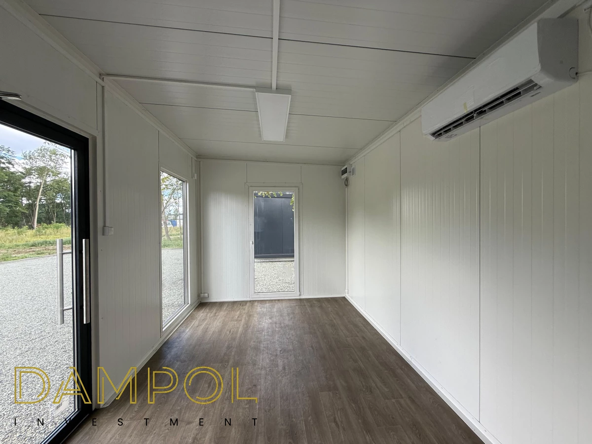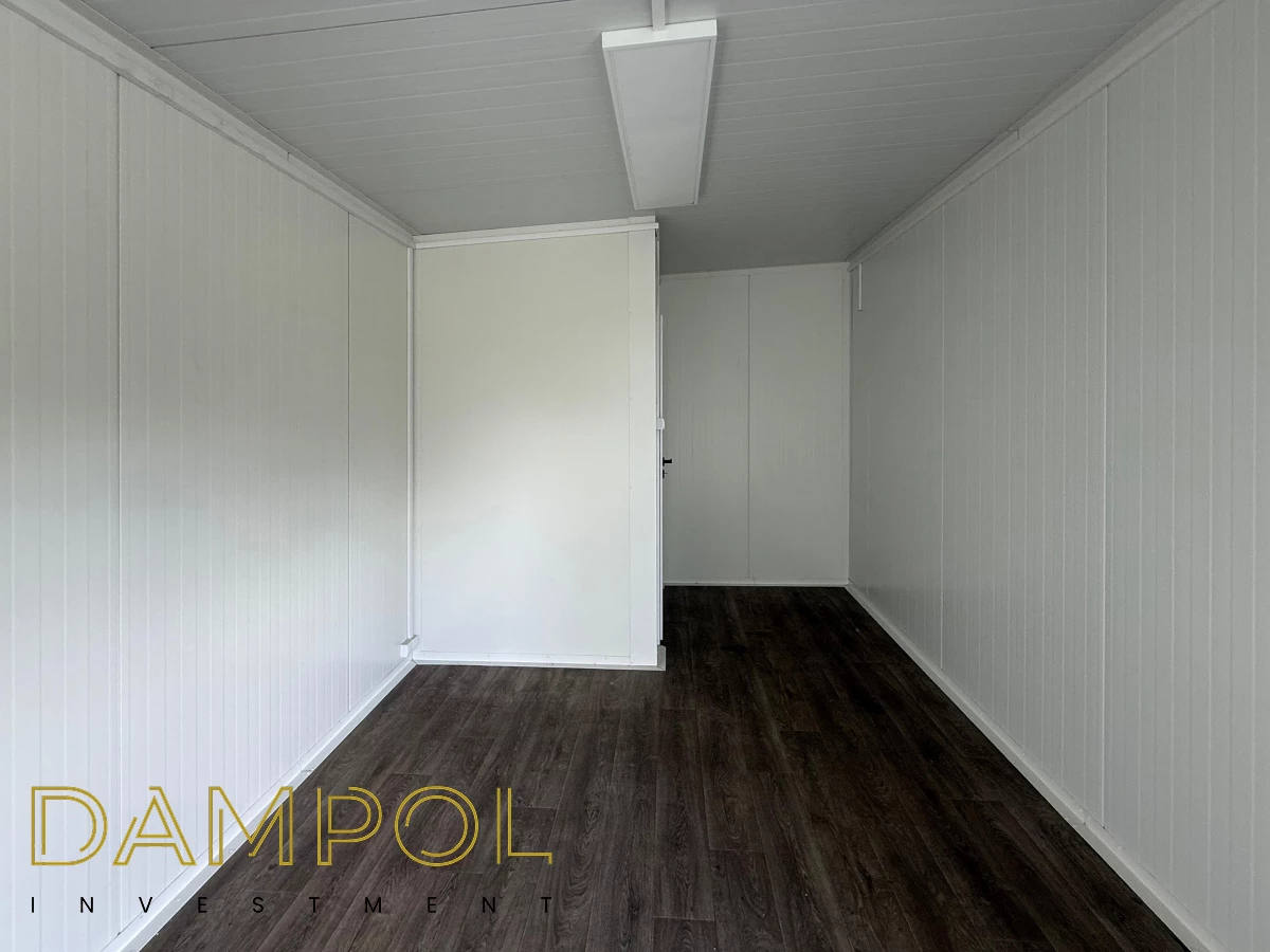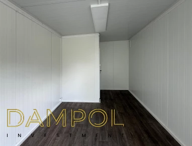 Drzwi aluminiowe z podchwytem i samozamykaczem, 2x szyba stała (fix), 1x okno balkonowe, wydzielone pomieszczenie z oknem PCV 50x50, instalacja elektryczna jednofazowa, 3 podwójne gniazdka, 3 lampy, 2x lampka zewnętrzna.