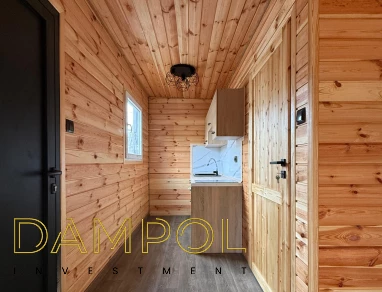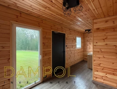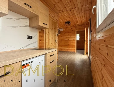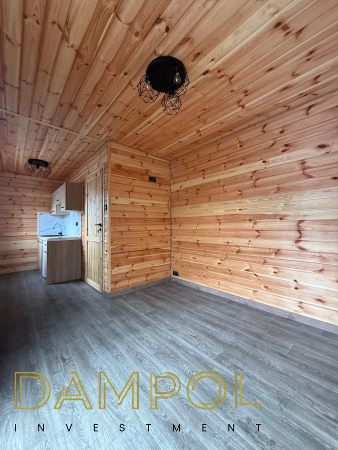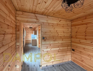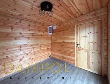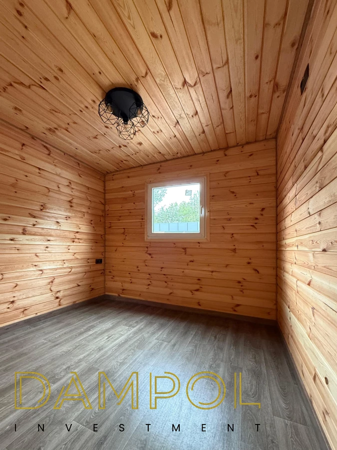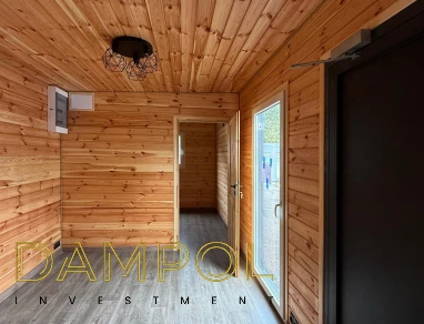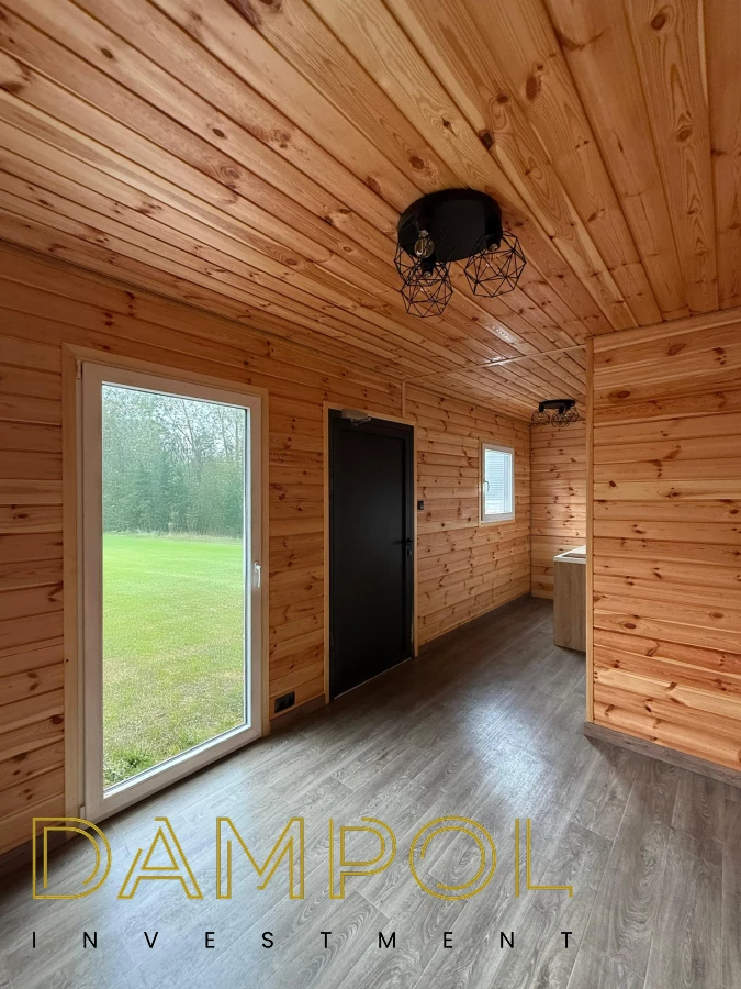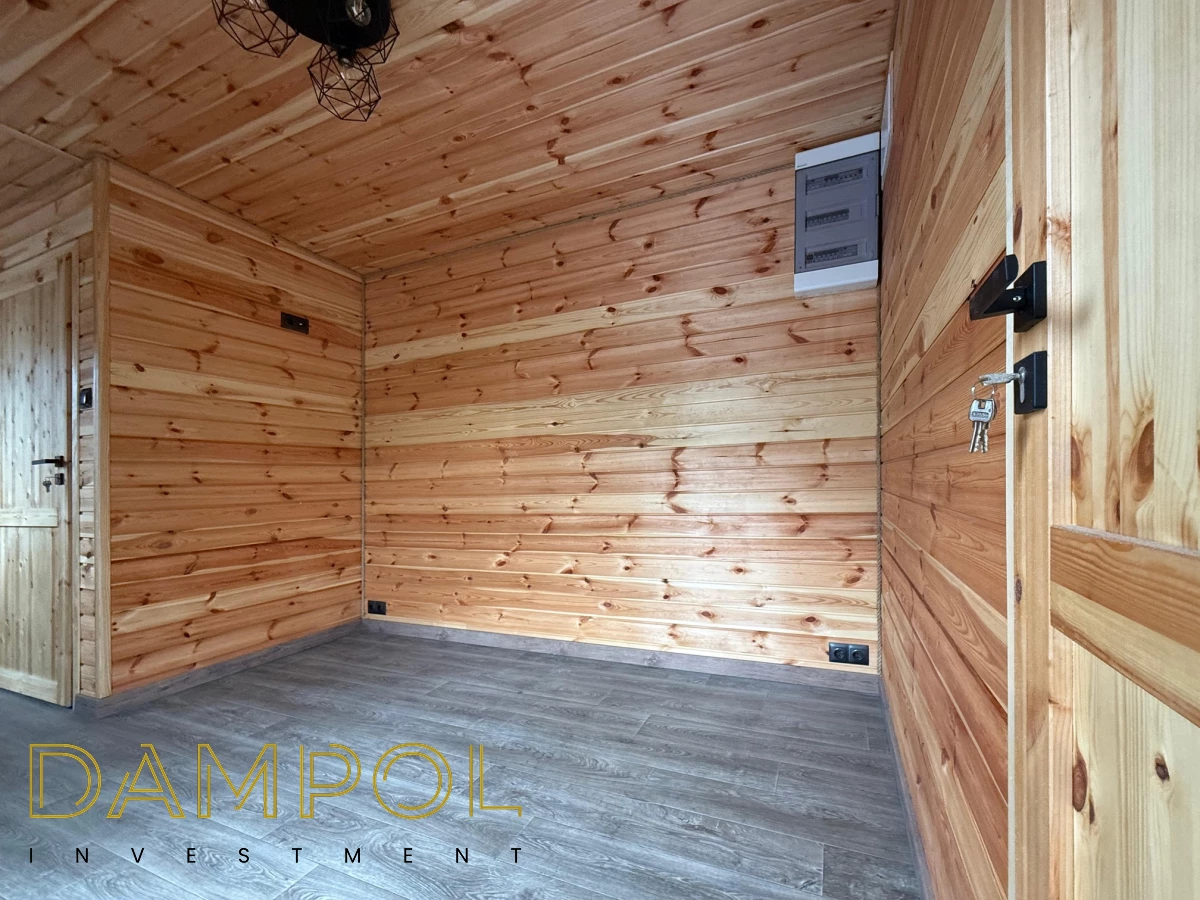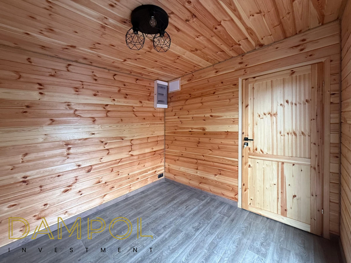 W środku pawilonu wykończenie to boazeria oraz imitacja płytek (łazienka + nad aneksem kuchennym)