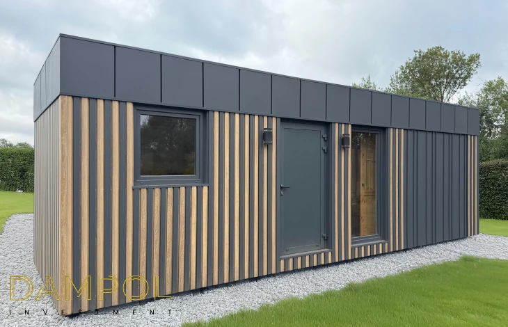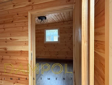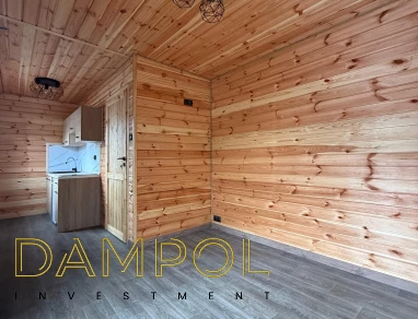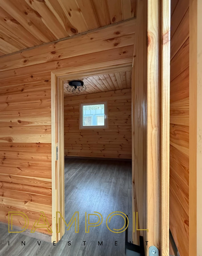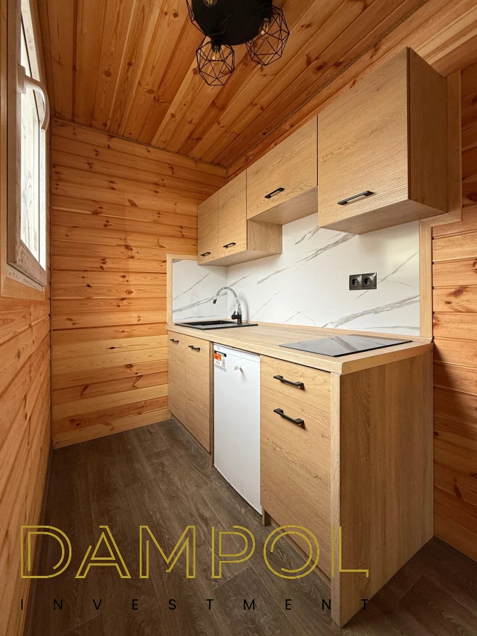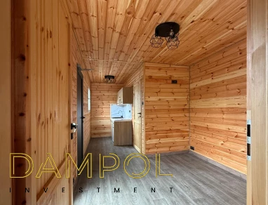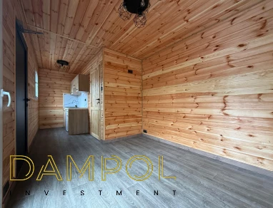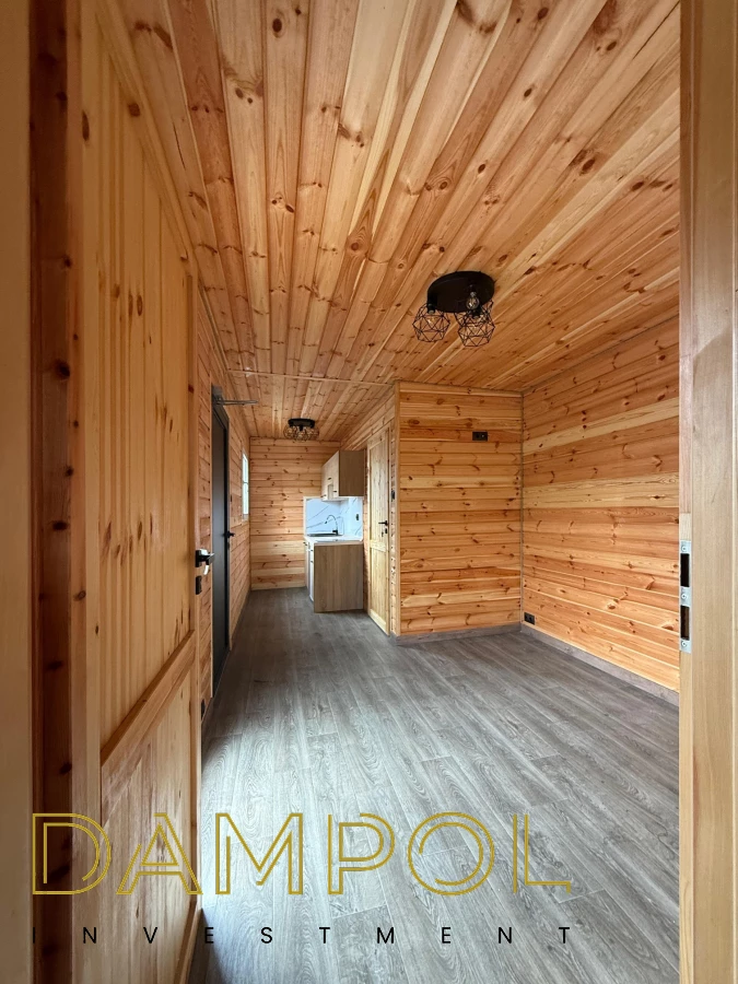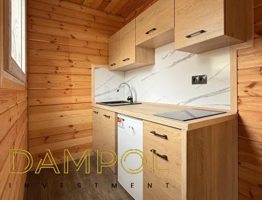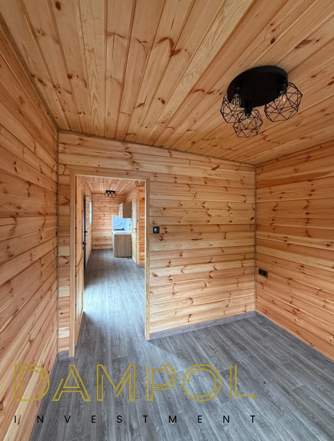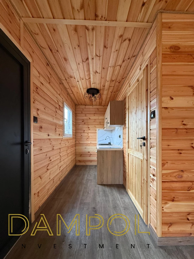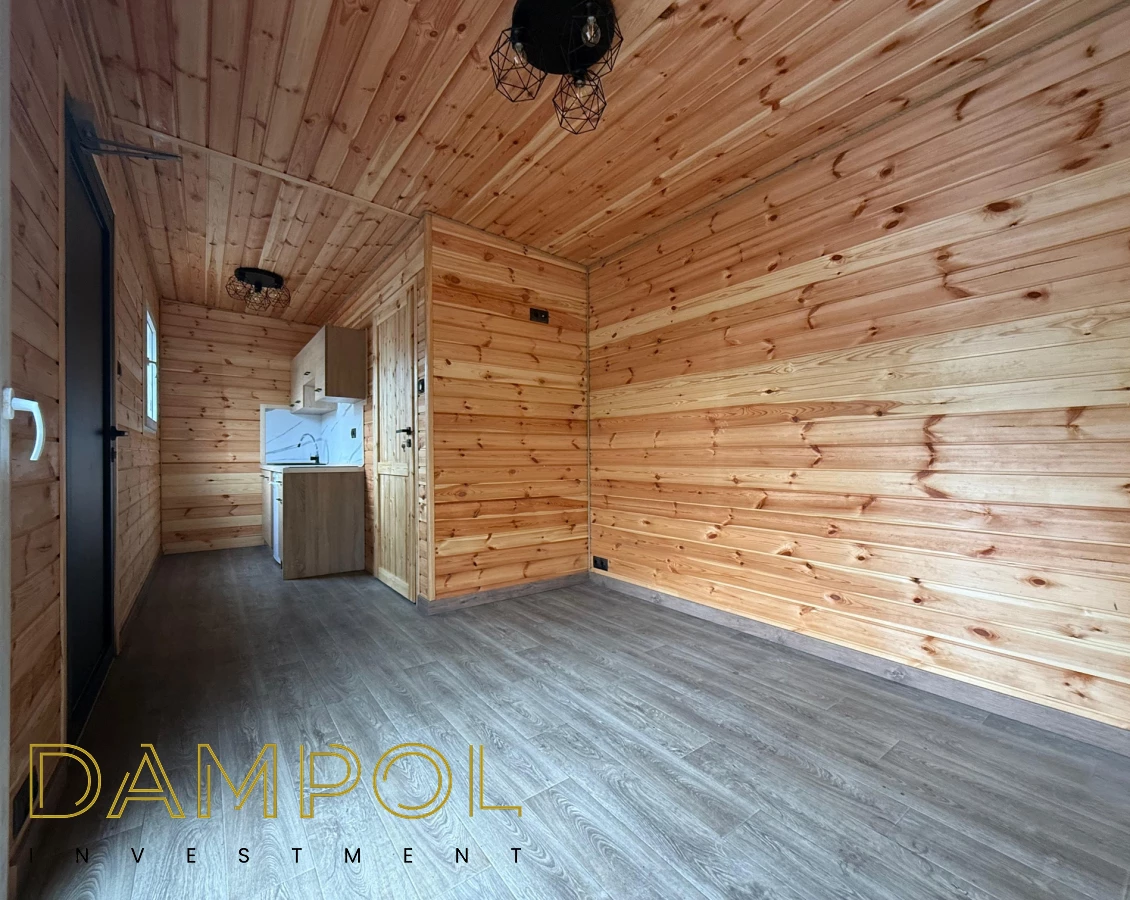 W środku pawilonu wykończenie to boazeria oraz imitacja płytek (łazienka + nad aneksem kuchennym)