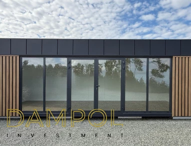 Hliníková truhlářská výroba: dvoukřídlé dveře spojené se 4 pevnými skleněnými tabulemi (fix) cca 600x220, na levé straně hliníkové balkonové okno 97x210, dekorativní výzdoba čela + 2 strany: winchester + hadice v barvě grafitu, kazeta v barvě grafitu.